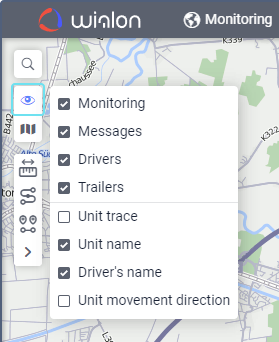 Such tabs as Monitoring, Tracks, Messages, Reports, Geofences, Routes, Drivers, Trailers and Passengers can have their layers on the map. Graphic elements applied to a map when working on a particular tab can be easily switched on and off. Displaying or hiding the graphic information on the map is adjusted for each layer individually in the layers menu, which can be opened by clicking on the Eye icon in the upper left corner of the map. Here you can read more about the work area.