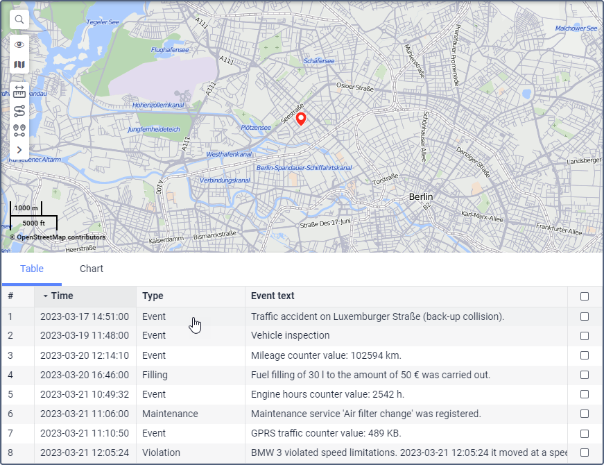 The description of the event. If the event is registered by means of a notification, the description is taken from its text. If it is registered by means of a job, the system generates the description automatically. In the case of manual registration, custom events and unit statuses are displayed with the descriptions specified by the user, while fuel fillings and maintenance services have the descriptions generated automatically.