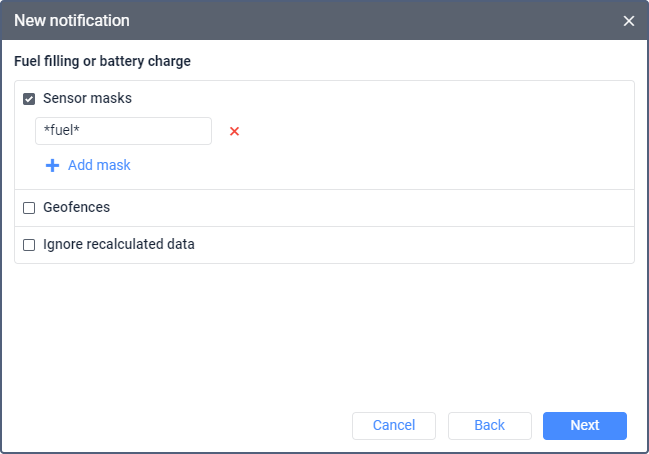 In the Sensor masks option, you can specify one or several masks of the sensors that should be used for detecting fuel fillings or battery charges and their volume.