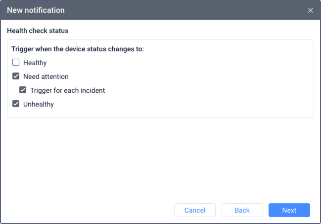 The Health check status notification allows monitoring the state of the unit device. You can configure the notification triggering when the device status changes to the following statuses.