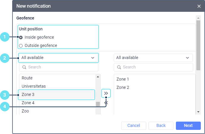 Also, whether the unit is inside or outside a certain geofence can be an additional condition for triggering the notification. For this purpose, enable the Geofence option and configure the settings described in steps 1–4 in the same-name notification type.