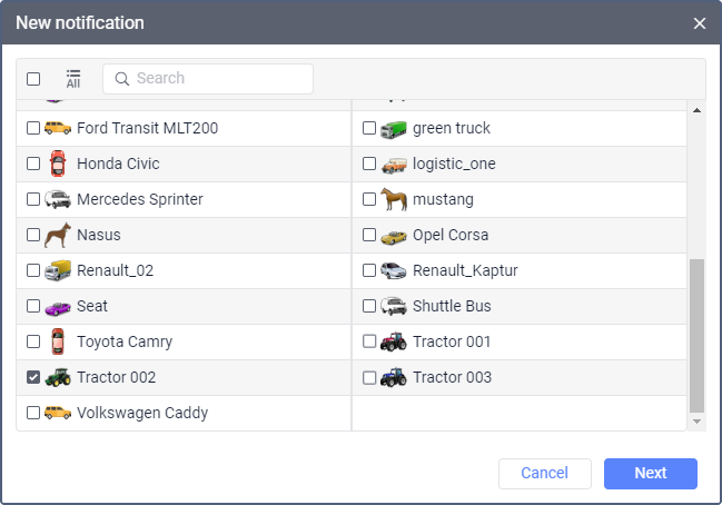 Move to the right side of the window the unit or units that affect the notification triggering taking into account the distance towards them. To find the required unit, use the dynamic search above the list.