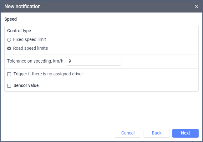 If necessary, set additional conditions for the notification: speed of the unit selected in step 1 and its sensor value. The latter option is configured in the same way as the notification type of the same name.