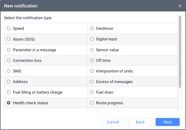 Depending on the conditions of triggering, notifications in Wialon are divided into types which you can select when creating the notification.
