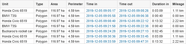 | Duration in | The time the unit stayed in the geofence. If the interval type is Outside geofence, the column shows the duration of the unit stay outside the geofence. |
