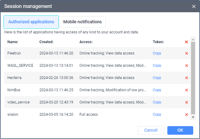 The Session management window shows the list of applications that have access to your account and the list of devices that can receive mobile notifications from Wialon. The lists are formed automatically after logging in to the application.