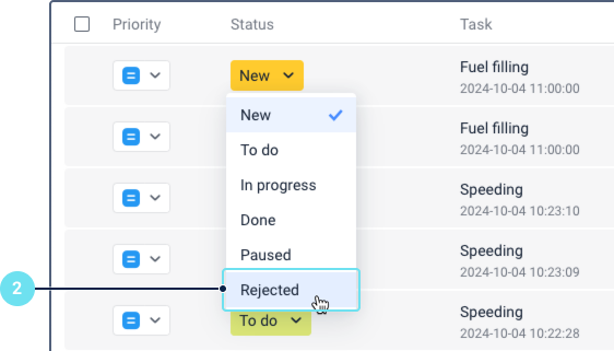 After the event is registered, the task appears in the list of tasks with the New status. You can change the status of one task or several tasks at once.