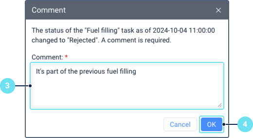 If you selected Done, Paused or Rejected, leave a comment. Comments are also required when changing the task status from Done and Rejected to any other. Comments are limited to 50 characters.