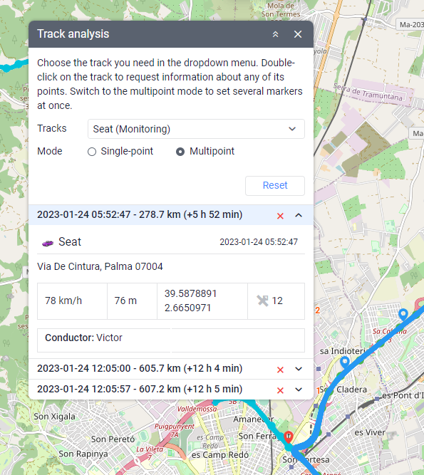 - Select the track analysis mode: single-point or multipoint. The multipoint mode allows you to see information about several points in the tool window. When you select a new point in the single-point mode, the information about the previous one is deleted.