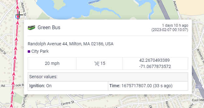 When you hover over a track, the nearest point from which a message was received within a radius of 50 pixels is highlighted with a pulsating circle. The point tooltip can display the following information: