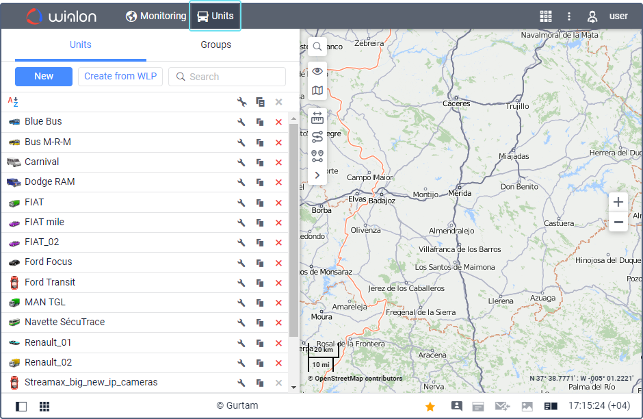 On the Units tab, you can create units and unit groups to monitor them later on the Monitoring tab. Here you can also perform the following actions with units: sending SMS messages, editing unit properties, copying, and deleting. There is a dynamic search which works by unit name on the tab.