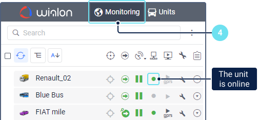 Go to the Monitoring tab to which the created units are added automatically. Make sure the unit is connected and is sending messages to the system. In this case, a green marker is shown in its row in the Connection status column of the list.