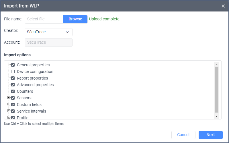If you have a WLP file with saved unit properties, you can create a unit with the properties already configured. To do this, click Create from WLP, select the file and the settings you want to add to the unit properties, and click Next.