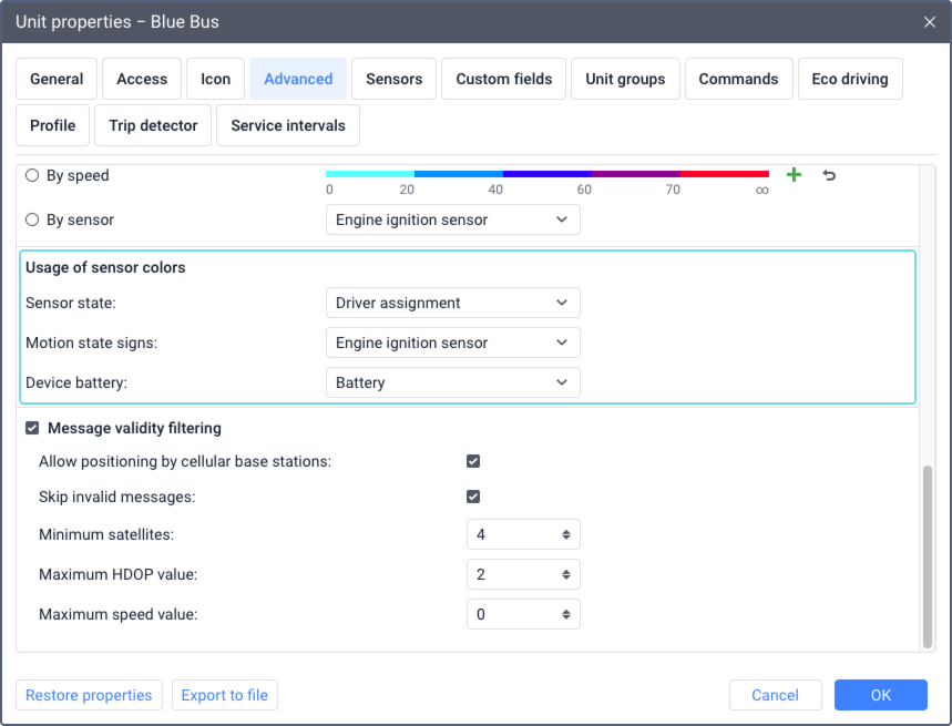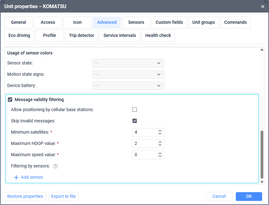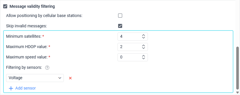 To solve this problem, Wialon provides message validity filtering. This feature allows you to specify the criteria that determine whether a message is valid or not. If a message is invalid, it is saved in the database without the information received from GPS: that is, without speed, coordinates, number of satellites, altitude, and movement direction. The other data from such a message (for example, sensor values) is saved and can be used in the system.