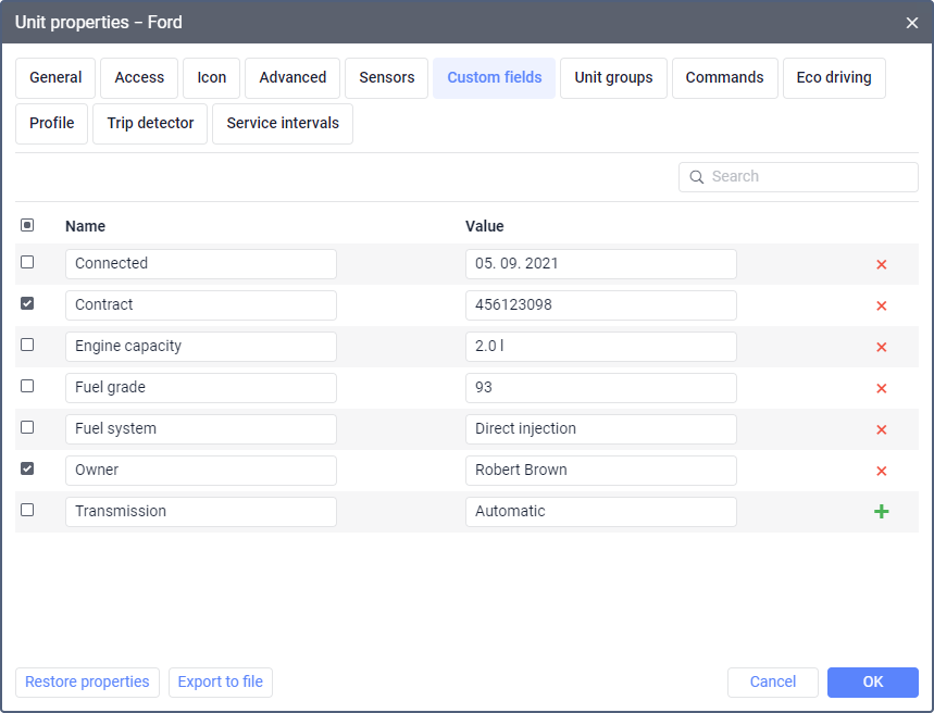 On this tab, you can create custom fields with additional information about the unit (for example, year of manufacture, fuel grade, engine capacity, and so on).