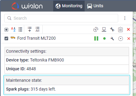 All the created service intervals and their execution state can be shown in the unit tooltip and in the extended unit information on the Monitoring tab.