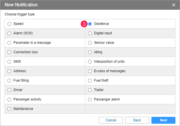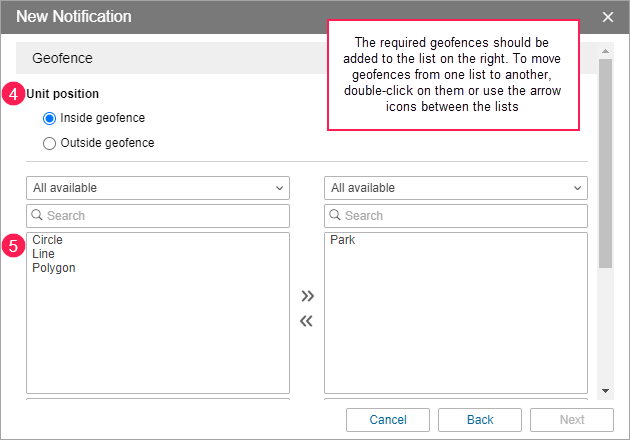 - Select the control type Inside geofence (the notification is triggered once the unit enters the geofence).