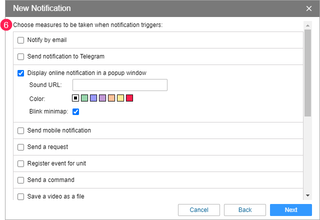 Depending on the selected action in step 6, triggering a notification may also be a signal to perform various actions: executing a command, changing access to units, sending a report via email, and so on.