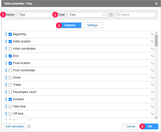 - Check the required columns (3). In this example, we mark the following columns: Beginning, Initial location, End, Final location, Duration.