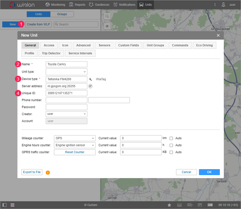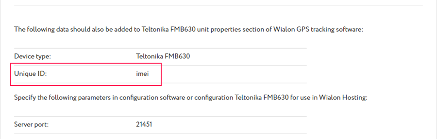 To learn what serves as an identifier for the device, find the latter in the Integrated Devices section of our website. For each device compatible with Wialon, the Unique ID field specifies what information should be used as the identifier. It can be the IMEI of the device, serial number, or a custom numeric value that should be entered by the user. For instance, for Teltonika FMB630 the following information is displayed: