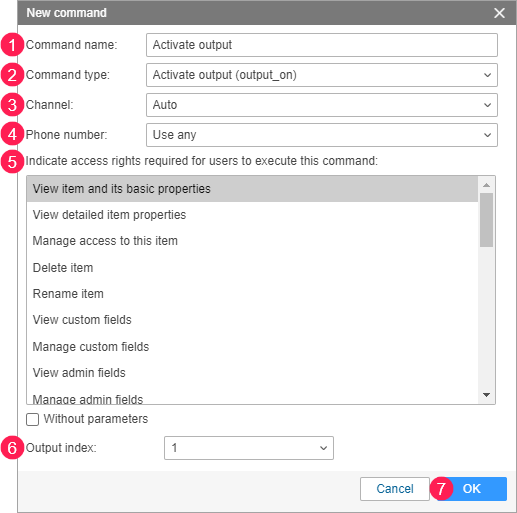 - Indicate the following: command name (1); command type (2); channel (the type of connection) (3); phone number to which the command should be sent (4); access rights the user requires to execute the command (5); output index that should be activated (6).