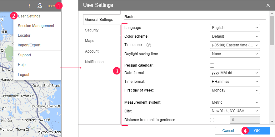 On the General settings tab, specify the interface language, time zone, date and time formats, measurement system.