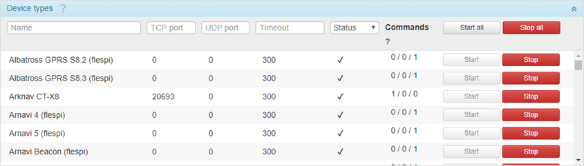 | Commands | This column displays the number of commands available for the devices of this type and transferred using the TCP, UDP, o Virtual channels. The tooltip contains detailed information with the names of all commands for each channel. |