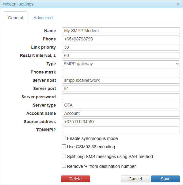 | Enable synchronous mode | SMPP synchro mode may be useful to make hardware diagnostics. This works by the following algorithm: while there is no notification that the first SMS was delivered, the second one will not be sent. |