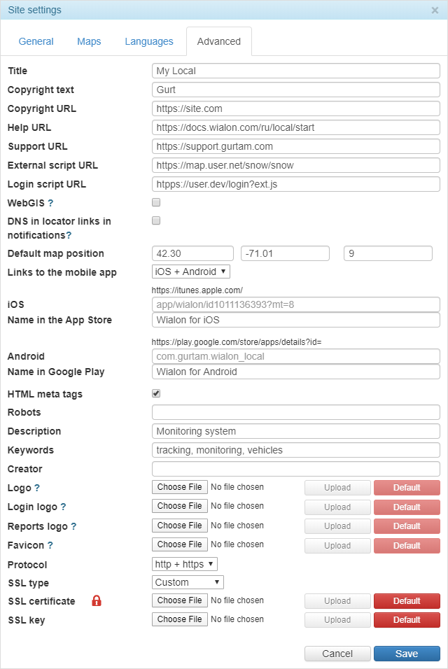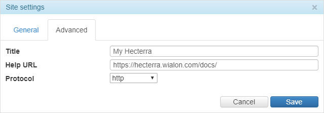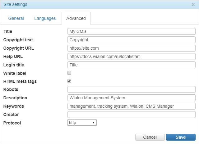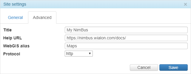 | Protocol | To work using the https protocol, the site (Wialon Web or CMS Manager) indicated in the Base URL field on the General tab is also required to work with it (i.e. in the Protocol field, either http + https or https should be selected). |