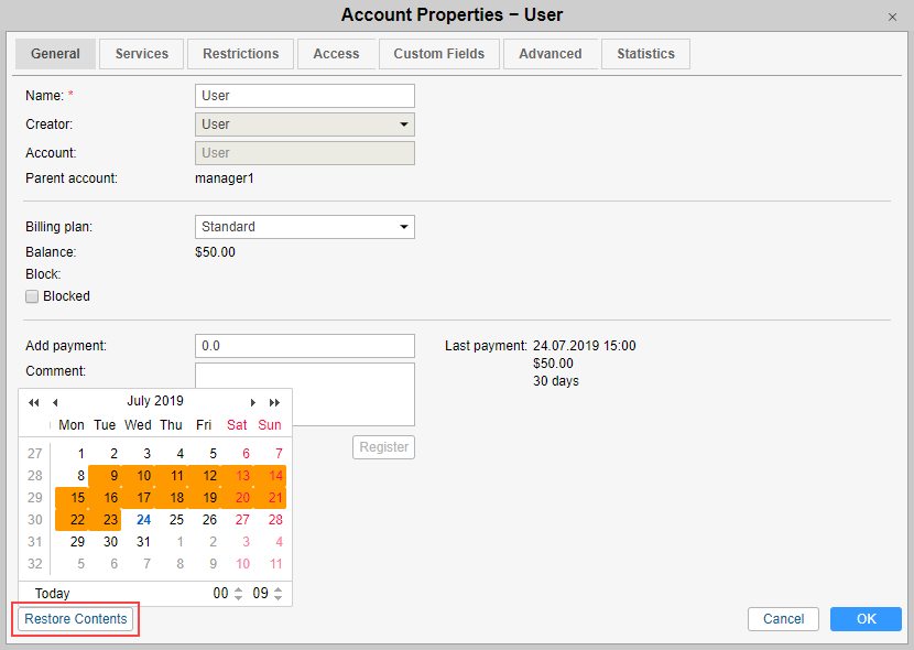 - Click on the name of the resource or account for which you want to restore the resource contents. In the properties dialog, click on the Restore contents button.