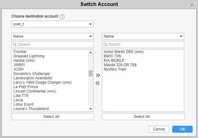Moreover, it is necessary to possess the View item and its basic properties right towards the creator of the unit and Act as given user towards the creator of the account you want to transfer the units to. The latter, in turn, must have the right to view the item and their properties towards the units from the right list of the dialog of switching account.