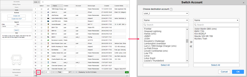 After selecting the units, in the dropdown list in the upper part of the dialog, you can see the accounts these units can be transferred to (based on the access rights). Choose the necessary account and click OK. Confirm your actions. As a result, for the units the creator and belonging to the account will be changed; for the accounts — the counter of created/available units.