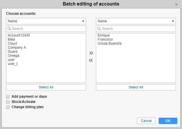 in the tools panel to open the editing window. Transfer the required accounts from the left list to the right one (for search convenience, filtering by name, creator, account, billing plan, custom and admin fields and dynamic filter are available).