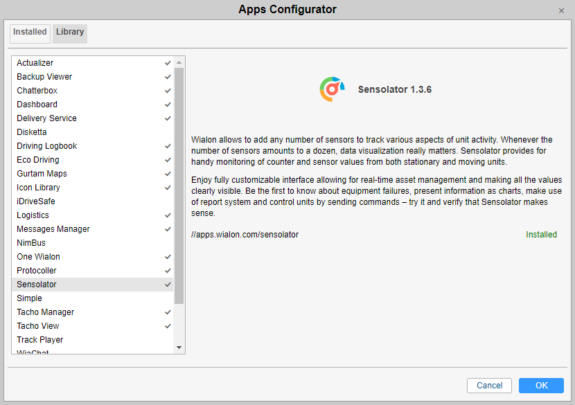 Applications can be managed only by top users. The Apps configurator item of the user menu allows you to do this. Click on this item to open the Apps configurator dialog. It contains two tabs: Installed and Library. On these tabs, you can have a look at all the available applications, as well as configure and add new ones.