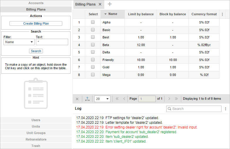 Table of results for billing plans contains the following columns: name of a billing plan, limit by balance, block by balance, block by days, and currency format.