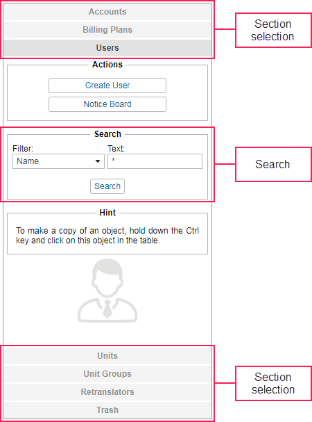 - Choose the section (Accounts, Billing plans, Users, Units, Unit groups, Retranslators).