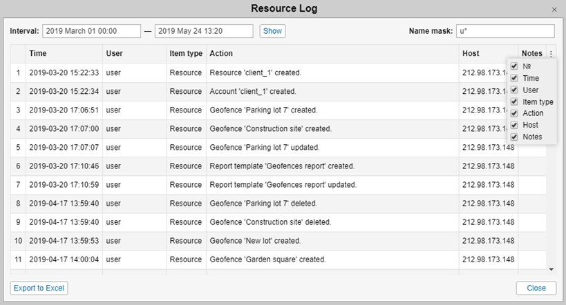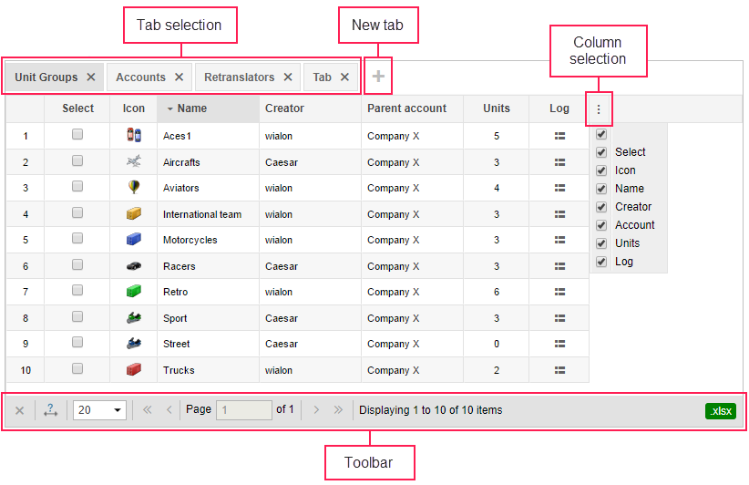 At the bottom of the table, there is the Tools bar that can be used to perform several tasks such as deleting items, moving to another page, etc. Moreover, when working with such system elements as accounts (resources), users, units, unit groups and retranslators it is possible to save table data in Excel format. To do this, click on the corresponding icon in the right corner of the tools bar.
