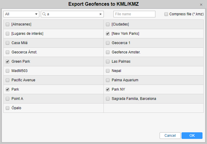 When you export to KML/KMZ, the list of all available geofences (depending on the item type chosen) is displayed. Check the items you want to export and press OK. Optionally, you can enter a file name and compress the file as KMZ. After that, press OK and save the file.