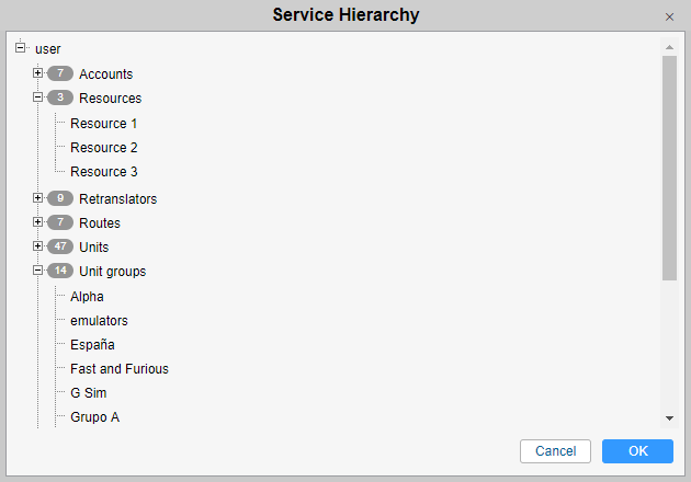 Service hierarchy is a sort of report with a schematic representation of the information concerning the structure of your service. Select the corresponding item in the user menu in order to generate a table containing information on the types of macro objects used in your service, their amount, and the way these objects correlate with each other.