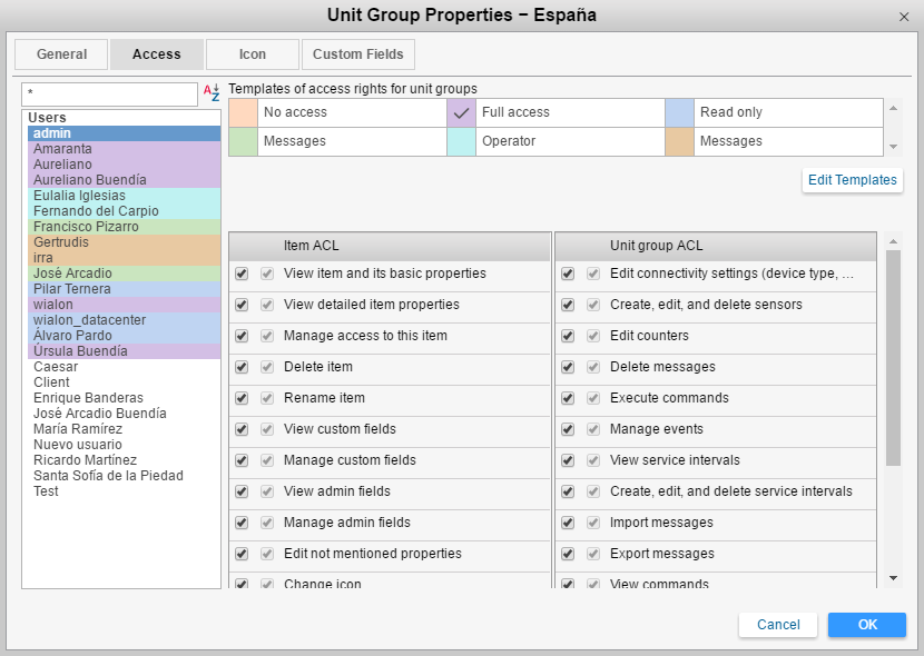 Select a user on the left and check access boxes for this user on the right. Access rights are divided into two sections — standard rights (Item ACL) and special rights (Unit group ACL).