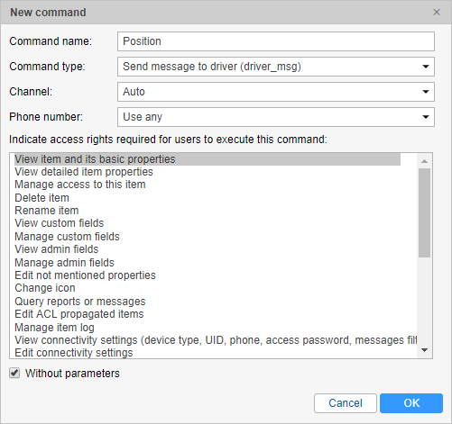 Some commands require additional parameters. It can be, for instance, the input/output number, report interval, etc. These parameters can be set when configuring the command, and in this case, they are applied automatically each time when the command is being executed. Thus, several commands with different parameters and link types can be created on the basis of one command type. However, it is not obligatory to set parameters when creating a command, because you can indicate them during the execution manually. To do so, mark the checkbox Without parameters. It is impossible to change parameters (as well as connection type or phone number) if they are set.