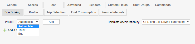 In the top left part of the Eco driving tab window, select one of the three available templates: Automobile, Truck, Bus.