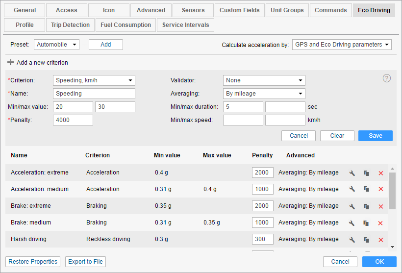 The Eco driving tab is a form where you should indicate the parameters used for penalty scoring. To add the eco-driving criteria, choose one of two options: use a preset criterion of one of the available templates or customize your own.