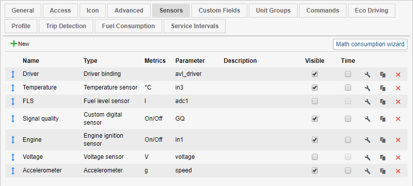 On the Sensors tab of the unit properties, displays a list of all the sensors created for this unit. The table shows the name of the sensor, its type, unit of measure, the parameter on which the sensor is based, description, visibility and time checkboxes. On this tab, you can view, create, configure and delete sensors.