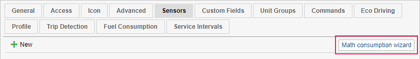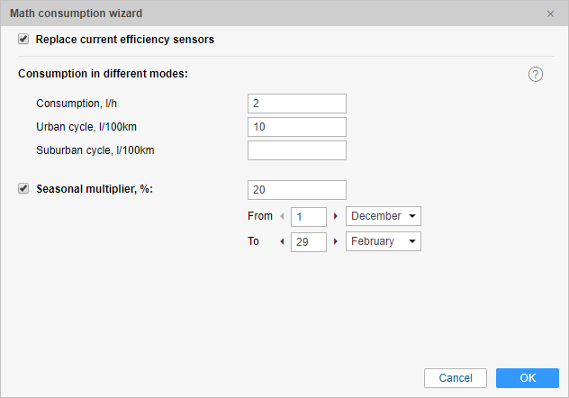 The wizard simplifies the process of creating and configuring the sensors for the mathematical calculation of fuel consumption. Calculation of fuel consumption is made in accordance with the speed of the unit.