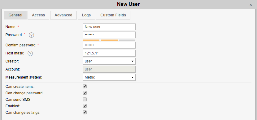 The hostmask can be applied to the user to restrict IP addresses from which this user can log on to the system (for example, to restrict access only to working computers). To set a mask, use the wildcard character *, for example, the hostmask can be set like this: 212.0.13.*. You can indicate several masks separated by commas. The maximum number of symbols in this field is 1024. If no mask is set, the user can log in from any computer.