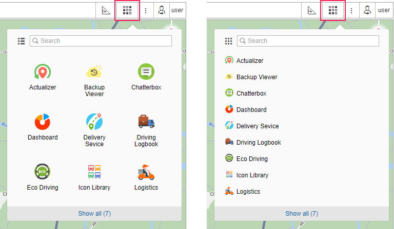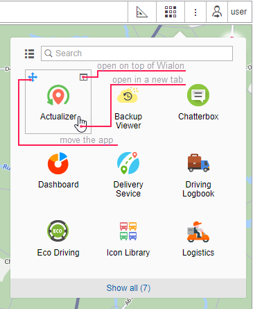 An application can be opened either in a new tab of the browser or in a separate window over Wialon. To open an application in a new tab, click its logo (name). In order to open it over Wialon, use the button
