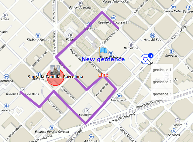 A geofence can be presented on the map by its name (if the flag Display names of geofences on map is enabled in the user settings), by the image or shape assigned (if that option is activated in geofence properties), as well as any combination of these three elements. The geofences that overlap each other can be replaced by one conditional item.