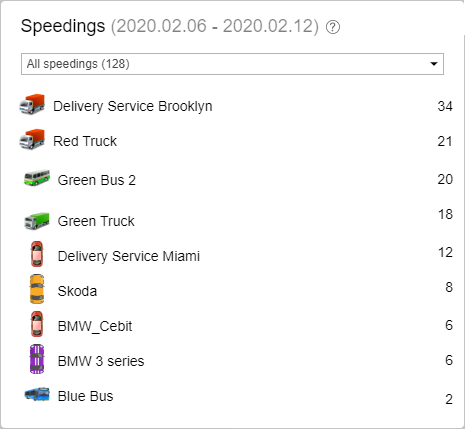 This block contains the list of units for which speed limit violations have been detected. Opposite the name of the unit, by default, the number of all its violations is shown. To filter them, select the necessary range of values in the drop-down list in the upper part of the block. For example, you can display the number of violations where the speed limit was exceeded by 10 to 20 km/h.