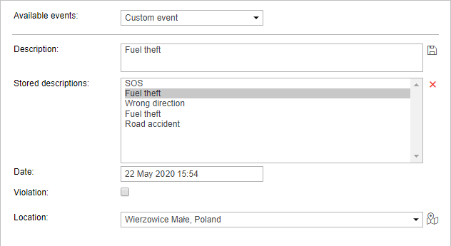 The description of the registered event can be saved. To do this, click on the Save icon to the right of it. The saved description appears in the list below. To select an existing description, click on it. To delete a description from the list, select it and click on the Delete icon.